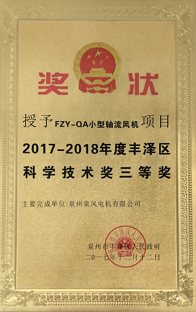 2017年 “FZY-QA小型軸流風”機獲得區科學技術三等獎。